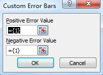 اما از آنجایی که معمولا برای هر نقطه، خطای مجزایی وجود دارد برای وارد کردن این خطاها باید از گزینه آخر یعنی Custom استفاده شود. پس از انتخاب این گزینه روی دکمه Specify Value کلیک کنید تا پنجره Custom Error Bars باز شود. اکنون پس از تعیین مقادیر مثبت و منفی خطا (positive/Negative error value)، روی OK کلیک کنید.