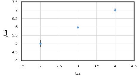 همانطور که مشاهده میکنید ۳ فشار اندازهگیری شده در هر دمایی با هم متفاوت هستند. در این حالت برای رسم نمودار از مقدار میانگین فشارها در هر دما استفاده میشود و تفاوت حداکثر و حداقل فشار نسبت به فشار میانگین، خطای سیستم را نشان میدهد که برای نمایش میزان خطای اندازهگیری از نوار خطا استفاده میشود.