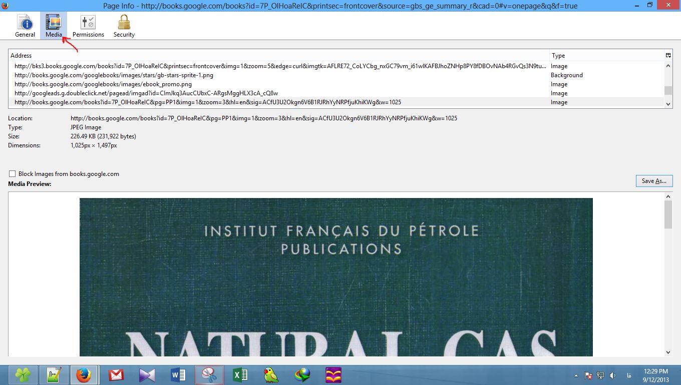 روش دوم) هنگامیکه یک صفحه کتابی را با مرورگر فایرفاکس مشاهده میکنید (در حالت زوم شده)، روی آن راست کلیک کنید و گزینه View Page Info را انتخاب نمائید. در پنجره باز شده (Page Info)، روی تب دوم (Media) کلیک کنید. لینک تمام اجزای صفحه در حال مشاهده در قسمت Address قرار دارد که پیش نمایش آنها در قسمت Media Preview نشان داده میشود.