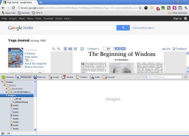روش اول) هنگامیکه یک صفحه کتابی را با مرورگر فایرفاکس مشاهده میکنید، پس از ذخیره نمودن این صفحه (Ctrl+S)، در پوشهی همراه فایل Html، صفحهای از کتاب که در حال مشاهده آن هستید به همراه صفحات قبل و بعد از آن بصورت عکس ذخیره شده میشوند. البته برای اینکه عکسها کیفیت بهتری داشته باشند باید در هنگام مشاهده روی آنها زوم کنید. این روش تنها در صورتی مفید است که تنها صفحات محدودی را نیاز داشته باشید.