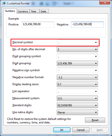 در پنجره Customize Format علامت اعشار در قسمت Decimal Symbol نشان داده شده است که می توانید علامت / را در آن تایپ کنید.