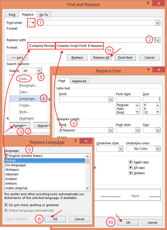 در نرمافزار ورد با فشار دادن کلیدهای Ctrl+H، کادر Find and Replace با تب فعال Replace باز میشود. برای جستجوی اعداد ابتدا در قسمت Find What کد #^ را تایپ کنید. سپس در قسمت Replace With کلیک کنید و از قسمت Format گزینه Language را انتخاب کنید. در پنجره Replace Language زبان Persian یا Farsi را انتخاب کنید و روی Ok کلیک کنید. اگر فونت خاصی هم مدنظرتان است از قسمت Format گزینه Font را انتخاب کنید و در قسمت Complex Script فونت را انتخاب نمایید و سپس و روی Ok کلیک کنید. در پایان روی گزینه Replace (اگر میخواهید بصورت موردی چند عدد را تبدیل کنید) یا Replace All (اگر میخواهید همه اعداد را تبدیل کنید) کلیک کنید تا فرآیند جایگزینی انجام شود.