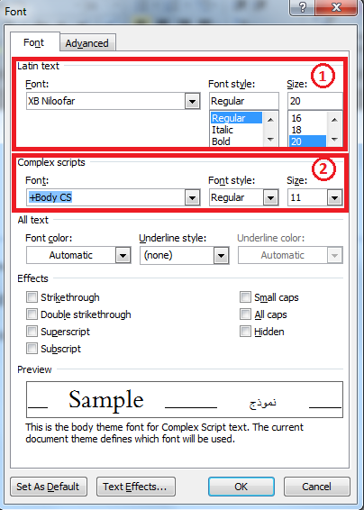 3- برای تغییر فونت انگلیسی و اندازه آن از قسمت Latin Text (قسمت 1 در عکس) و برای تغییر فونت فارسی و اندازه آن از قسمت Complex Script (قسمت 2 در عکس) استفاده کنید.