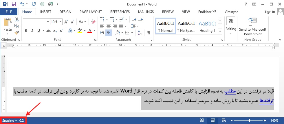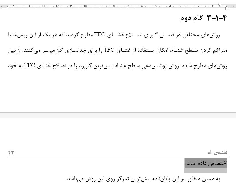 در این حالت شاید به ذهنتان برسد که فونت نوشته را کمی کوچک کنید تا تمام پاراگراف در یک صفحه نشان داده شود ولی کاهش فونت ممکن است متن را ناهمگون کند. راه پیشنهادی کاهش فاصله بین کلمات است که اگر این کاهش ناچیز باشد قابل تشخیص نیست مانند شکل زیر.