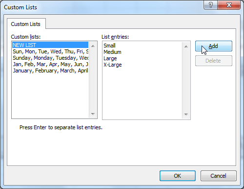 میخواهید سطرها را براساس ستون T-Shirt Size، به ترتیب Large، Medium، Small و X-Large مرتب کنید. چون نحوه مرتب کردن در اکسل براساس عدد و حروف الفبا و همچنین روزهای هفته و ماههای سال میلادی میباشد شما باید یک لیست سفارشی به لیستهای اکسل اضافه کنید تا اکسل بتواند اطلاعات شما را براساس خواسته شما مرتب کند. برای اینکار در پنجره Sort، در کادر Sort by ستون T-Shirt Size را انتخاب میکنیم. در کادر Sort On، پارامتر Values و در کادر Order، عبارت Custom List را انتخاب میکنیم.