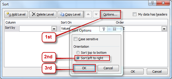 جهت مرتب سازی افقی تنها کافیست تنظیمات اکسل را از حالت پیش فرض ستونی به حالت سطری تغییر دهید.