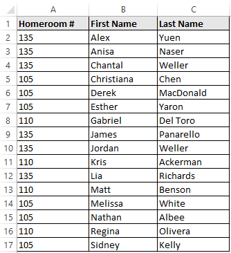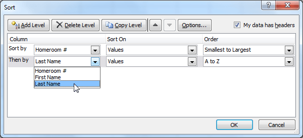 هدف ما این است که ابتدا اعداد جدول براساس ستون A بصورت صعودی مرتب شوند، اما چون در ستون A اعداد تکراری وجود دارد نحوه ترتیب سطرهای دو ستون دیگر را براساس ستون C قرار میدهیم البته به ترتیب حروف الفبای انگلیسی. بنابراین با چند معیار جهت مرتب کردن جدول روبرو هستیم. برای انجام اینکار در پنجره Sort، در کادر Sort by ستون A یا همان عنوان # Homeroom را انتخاب میکنیم. در کادر Sort On، پارامتر Values و در کادر Order، عبارت Smallest to Largest را انتخاب میکنیم. در مرحله بعد روی گزینه Add Level کلیک کرده تا کادرهای جدیدی ایجاد شود.