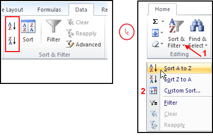 از منوی Data در قسمت Sort & Filter یا از منوی Home قسمت Editing، بخش Sort & Filter: