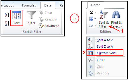 انتخاب گزینه Custom Sort از منوی Data در قسمت Sort & Filter یا از منوی Home قسمت Editing، بخش Sort & Filter: