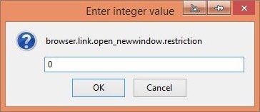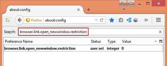 در مرحلهی بعد، عبارت browser.link.open_newwindow.restriction را در کادرSearch وارد نمایید. سپس در نتایج یافته شده(Preference Name) روی همین عبارت دو بار کلیک نمایید.