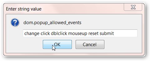 مشکلی که وجود دارد این است که با اعمال تنظیمات فوق همچنان ممکن است برخی از پاپآپها اجرا شوند چون تنظیمات پیش فرض فایرفاکس این اجازه را میدهد. اما این قسمت را هم میشود غیرفعال کرد. برخی از رویدادها مانند change, click, dblclick, mouseup, reset, submit, touchend با وجود مسدود شدن باز میشوند. برای غیرفعال کردن این رویدادها: