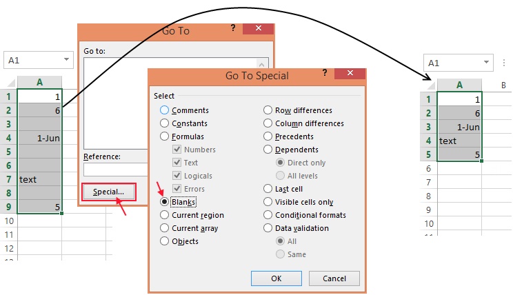 ۳- سپس بر روی دکمه Special کلیک کنید. در پنجره باز شده گزینه Blanks را انتخاب کرده و بر روی دکمه OK کلیک کنید. خواهید دید که با این کار تمامی سلولهای خالی به حالت انتخاب درمیآیند.